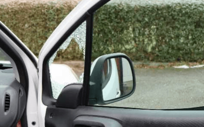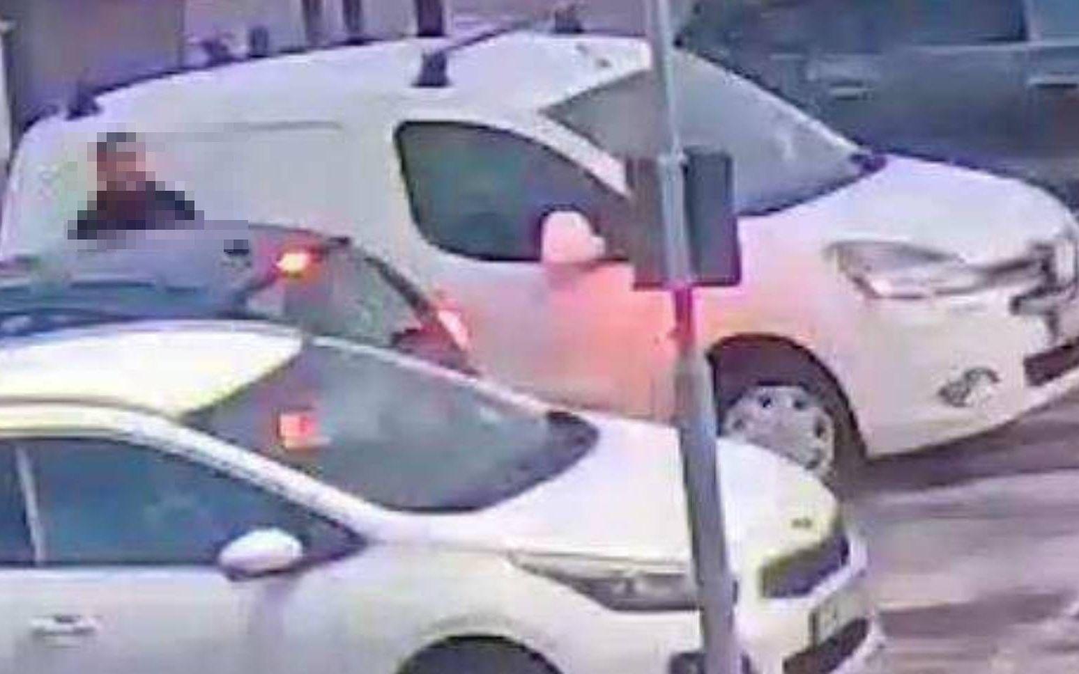 En man går ur personbilen och fram till skåpbilens förarsida där han plockar fram något ur högerfickan för att sedan spräcka skåpbilens sidoruta och sträcka sig in.