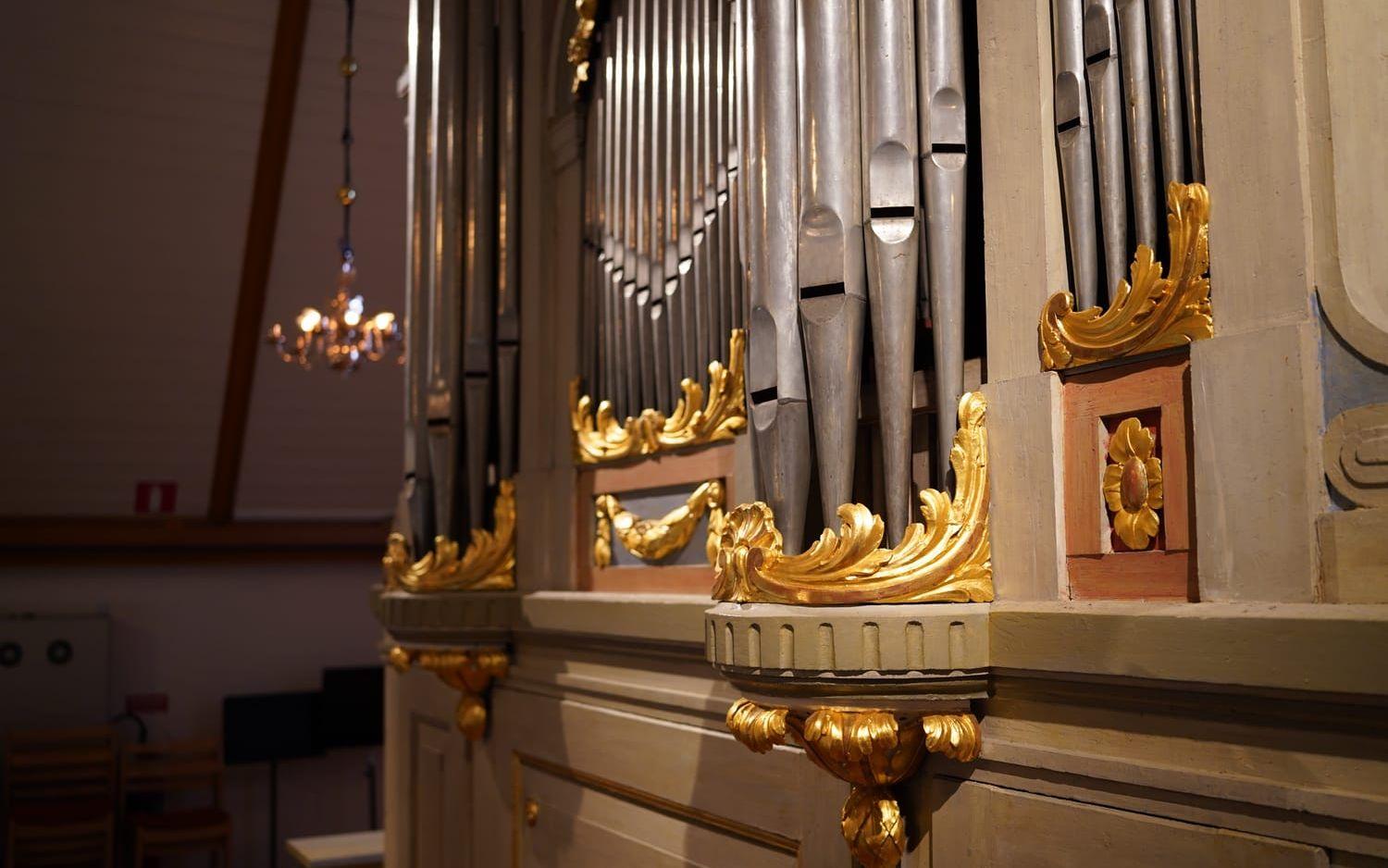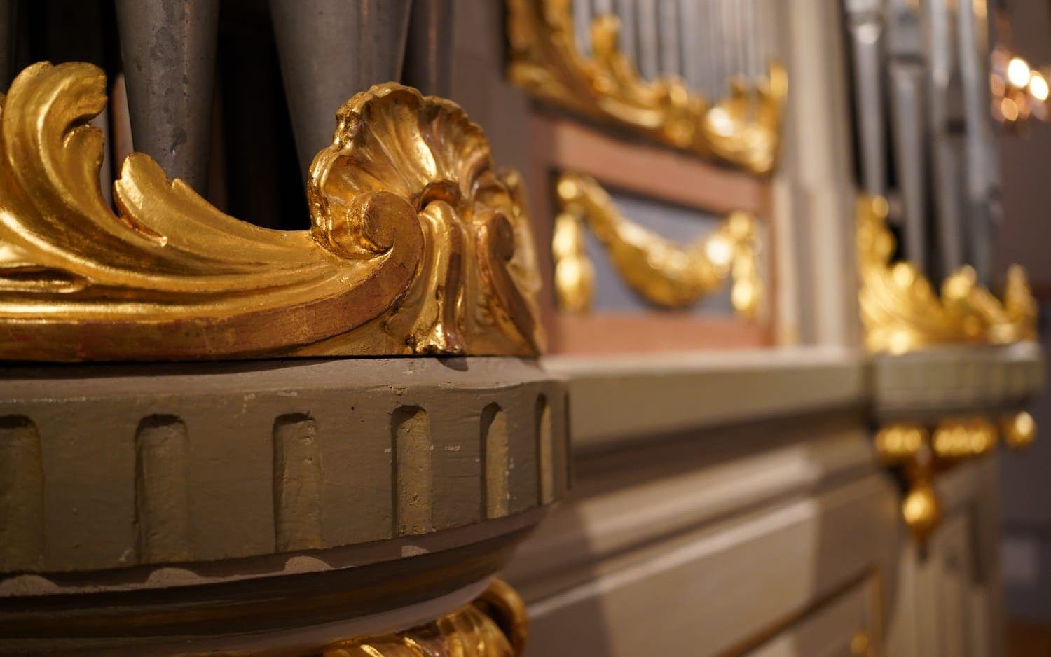 När vi väl kommer upp slås man av att orgeln med sina pampiga gulddetaljer inte alls är särskilt liten, men enligt Anna Lena är den liten i jämförelse med de bjässar som finns i andra kyrkor.