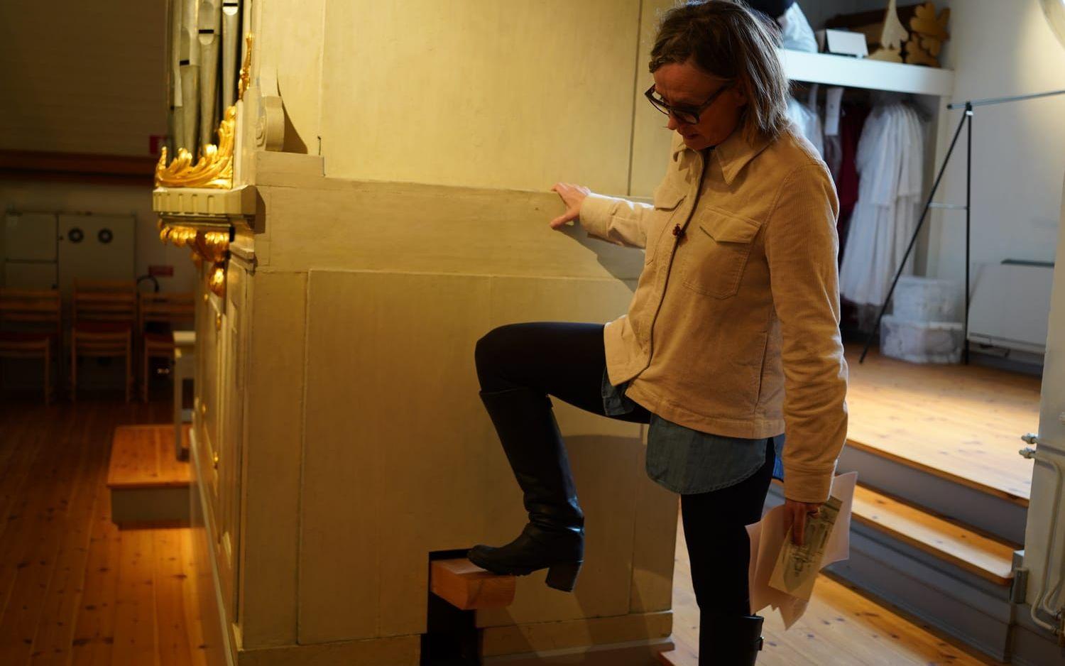 På en av orgelhusets sidor finns en liten trädplanka som Anna-Lena demonstrativt sätter foten på och förklarar att man förr i tiden var tvungen att leja in en stackare som stod och pumpade luft med muskelkraft för att det skulle bli något ljud.