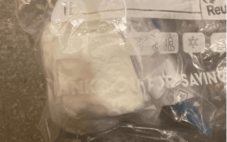 – När jag öppnar upp strumpan och tar ut innehållet är det två större ziplockpåsar som är instoppade i varandra och innehållet i den innerst på den är en stor vit kub och då får jag direkt känslan av att det är narkotika, säger väktaren i förhör.