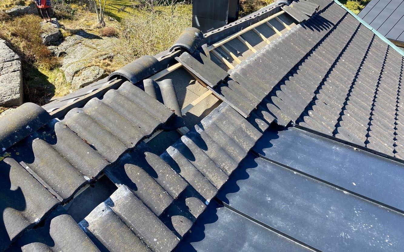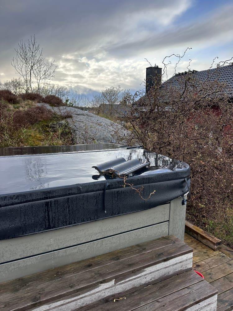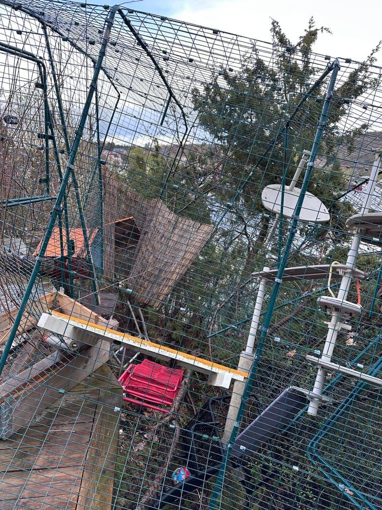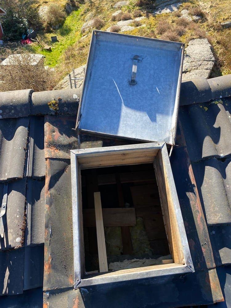 Det visade sig att hela baksidan fått sig en ordentlig omgång. Taket saknar flera plattor och på en film från grannens övervakningskamera kan man se hur de ryckts upp med vinden. En inspektionslucka i taket rycktes bort så att haglet gått rakt in i familjens innertak.