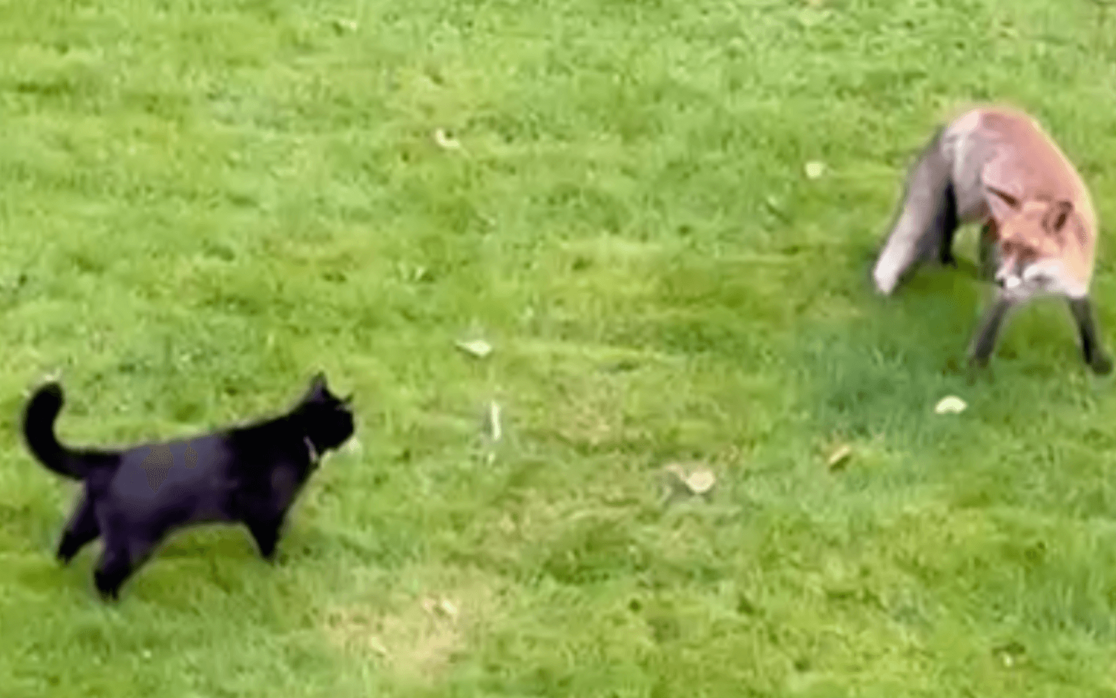 Men något angrepp blev det aldrig. I stället möttes de två djuren avvaktande, med nyfikenhet och respekt. Filmen, som är drygt tre minuter lång, visar hur räven rör sig lugnt genom trädgården innan den sätter sig bland pallkragarna.