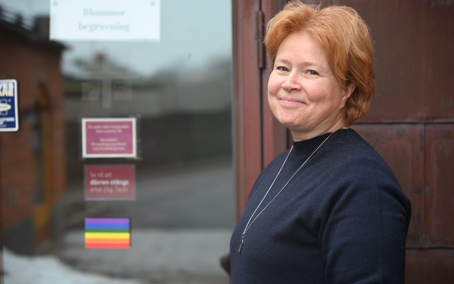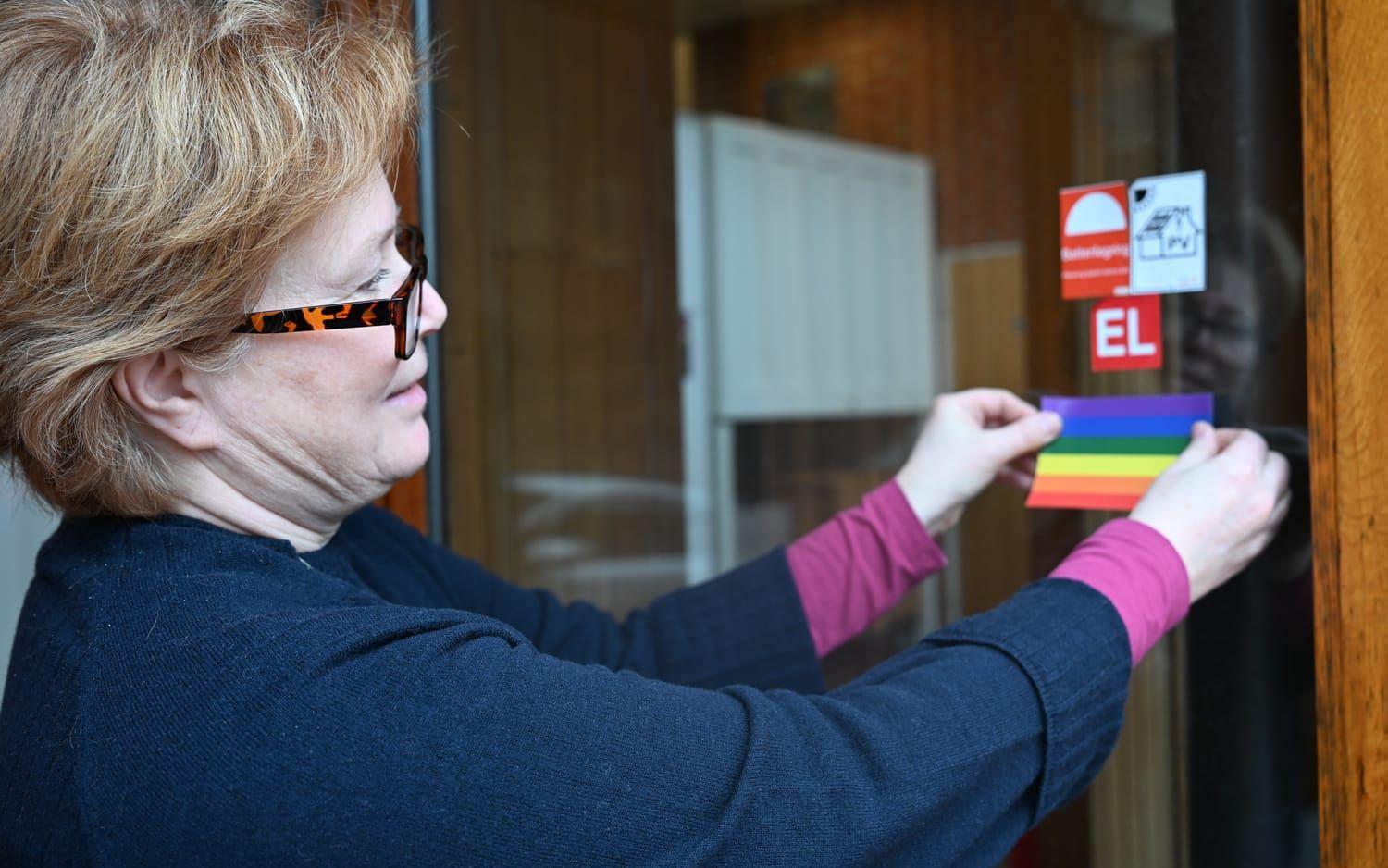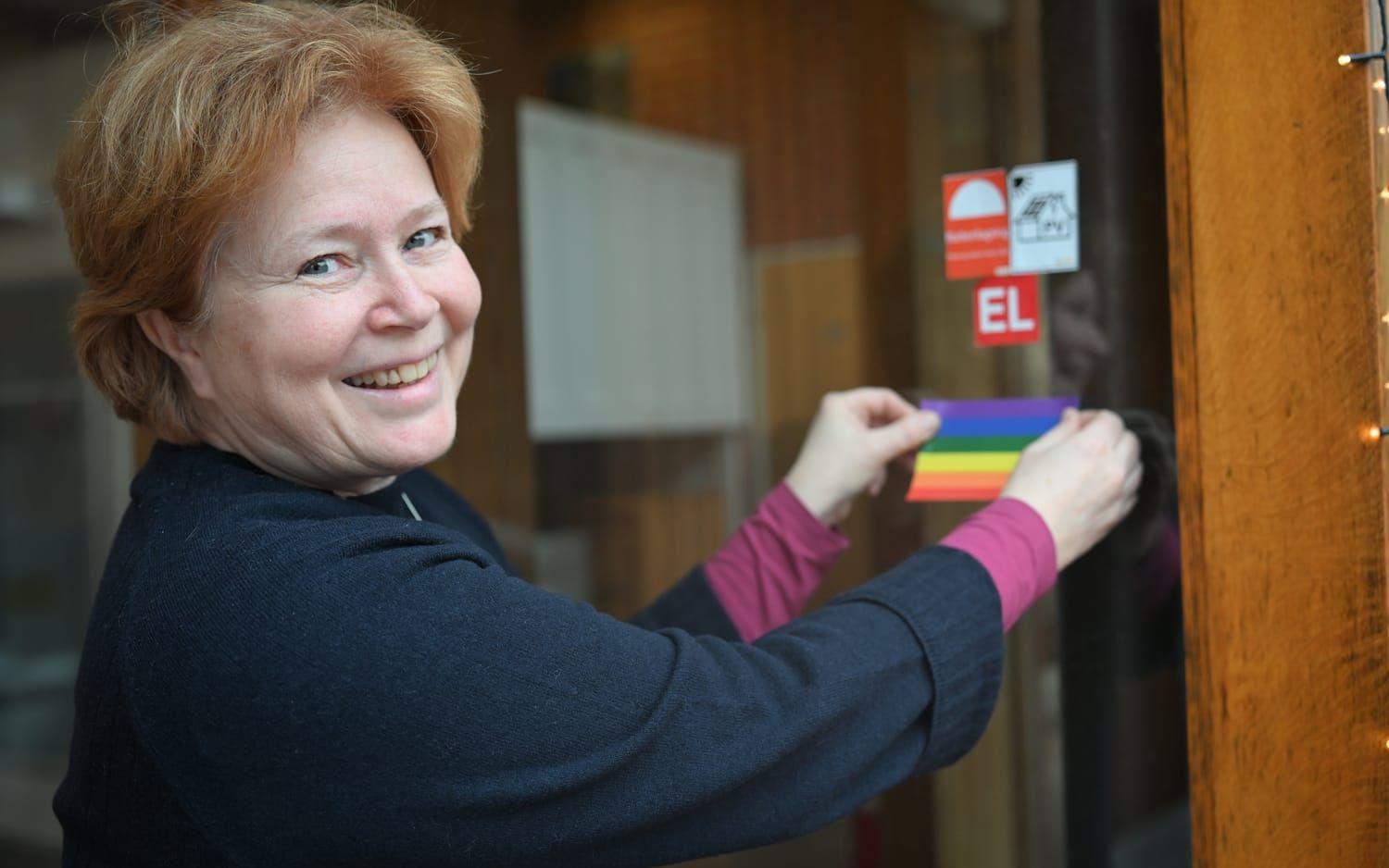 Leendet lurar i mungipan när Sävedalens församlingsherde, Sofia Eriksson, försöker lossa det regnbågsfärgade klistermärket från dess baksida. Någon minut senare pryder det entrén till Sävedalens församlingshem.