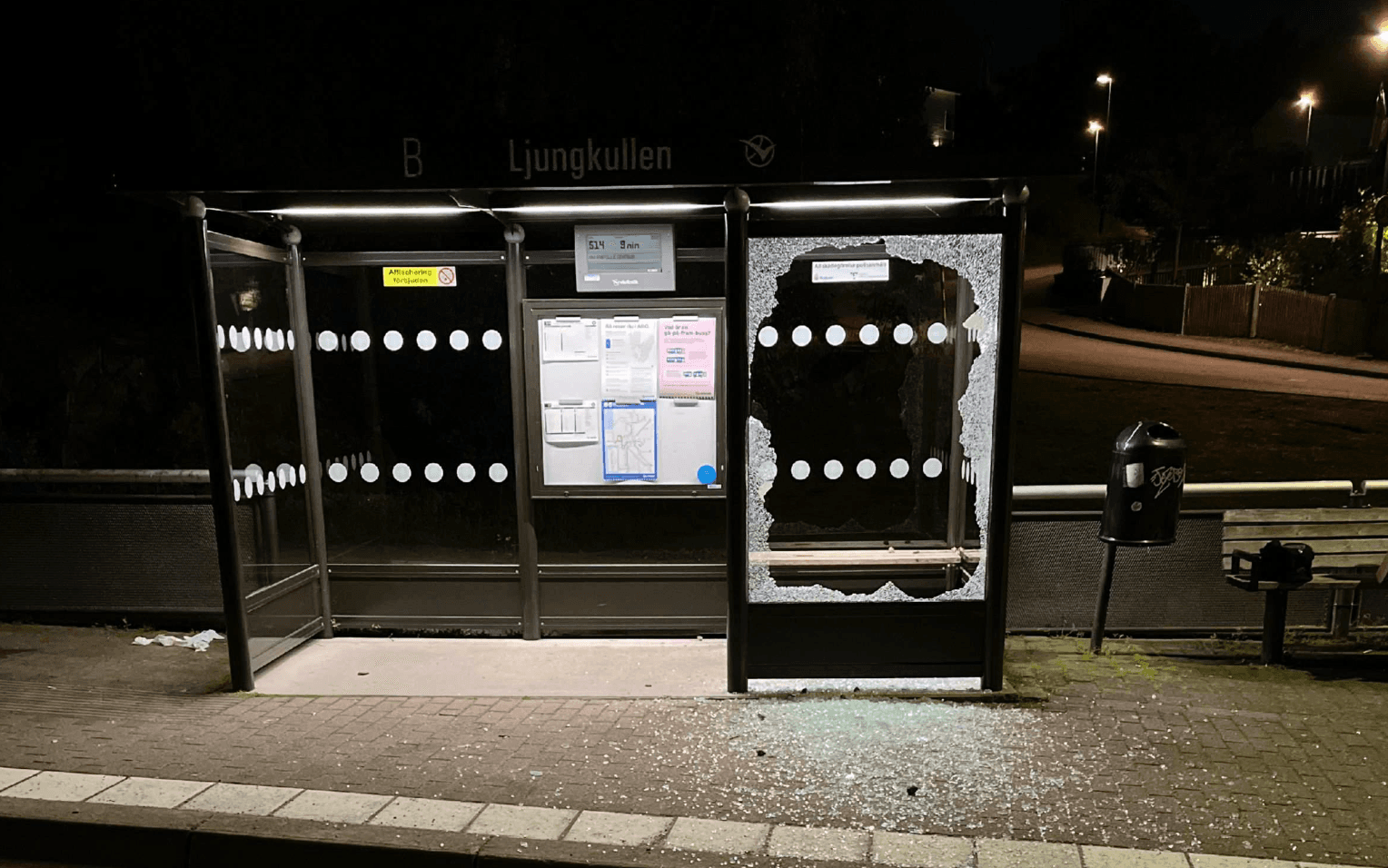 Sent en natt i juli kallades polisen till Ljungkullens hållplats i Sävedalen för att ta hand om en man med blodiga händer. En ruta i hållplatsens busskur var trasig – och mannen mycket berusad. Mannen togs in för förhör där han erkänner att han slagit på rutan, men att den redan var sönder när han gjorde det.